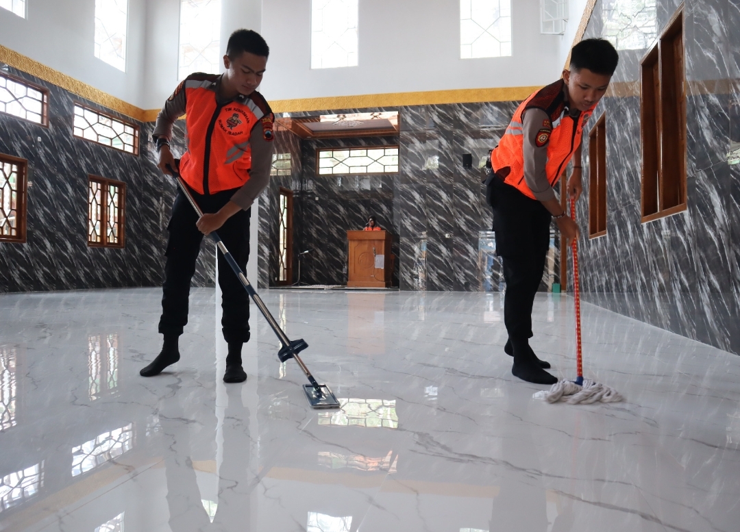 Setibanya di lokasi, para personel langsung sigap membersihkan setiap sudut masjid, mulai dari teras, serambi, ruang utama salat, hingga ruang imam. Para petugas membawa perlengkapan kebersihan seperti sapu, kemoceng, alat pel, hingga ember untuk menunjang kegiatan tersebut.