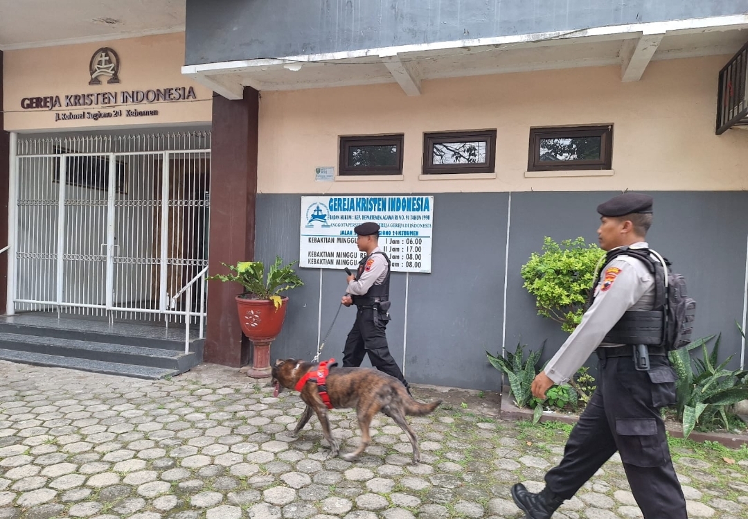 Unit K9 Satsamapta Polres Kebumen menerjunkan anjing pelacak untuk memastikan gereja benar-benar dalam keadaan steril. Setiap jengkal sudut gereja dilakukan pemeriksaan secara detail.